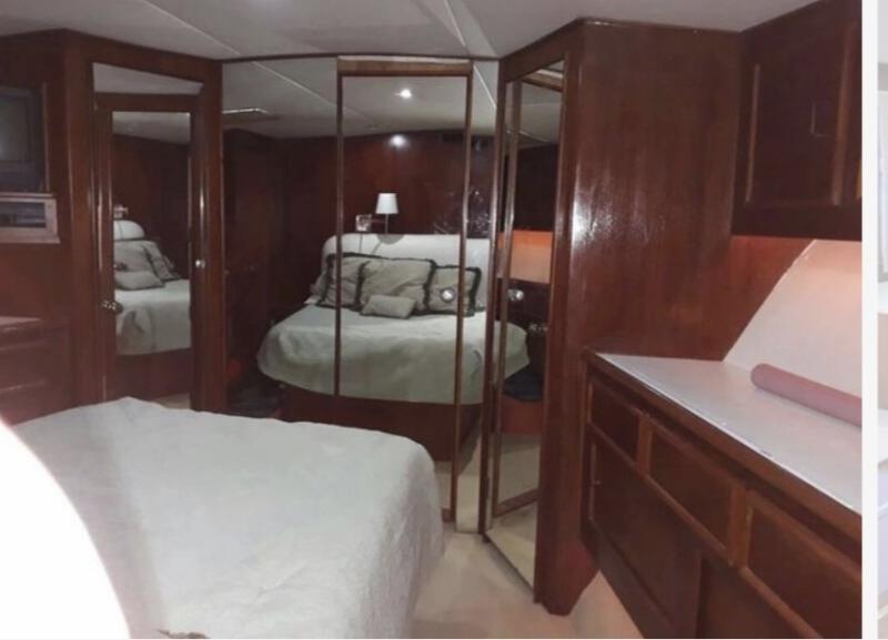 The Master is forward. It is entered on the starboard side. Walk-around queen-seized berth in in the center, headboard is on aft bulkhead. Master features wall to wall carpet. There are plenty of drawers and closets for storage. All the wood is teak with a satin finish. Master Stateroom has it's own AC/heat. The forward bulkhead is a full mirrored wall.