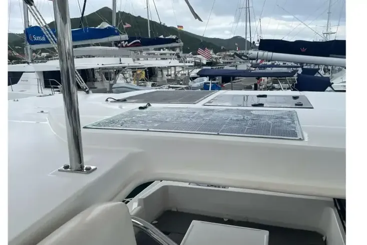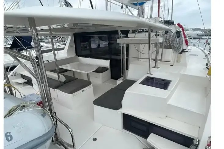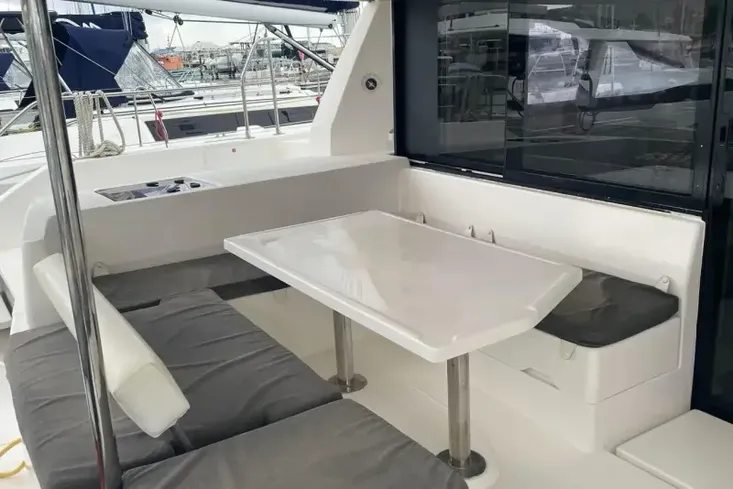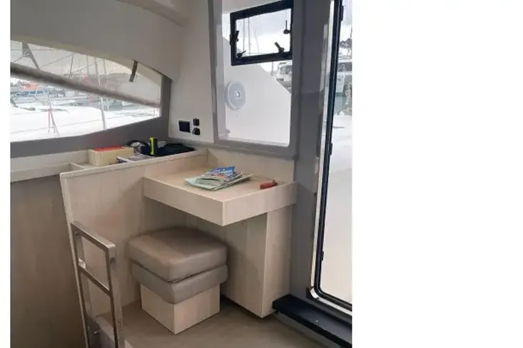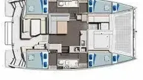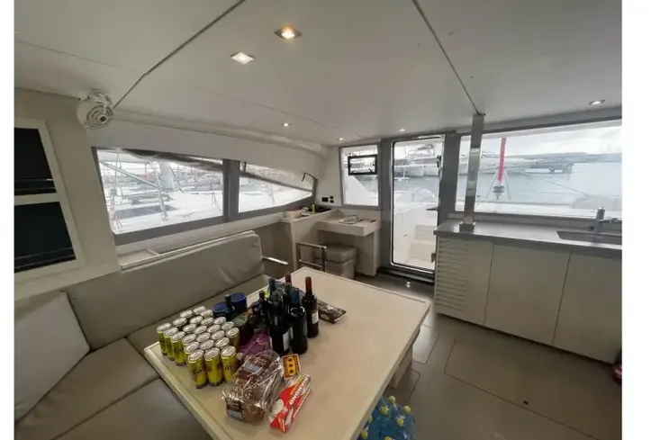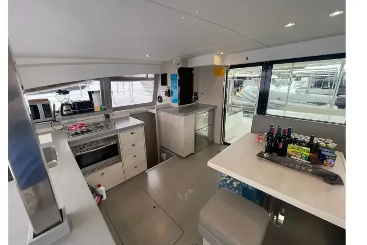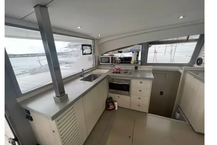BUILDERS REMARKS: The Leopard 40, a product of South African boat builders Robertson & Caine, features a unique, modern design thanks to experienced naval architects Simonis and Voogd as well as Robertson & Caine's design team. She resembles her predecessors in speed, agility, and blue-water performance, but her enhancements include an increased hull volume and an innovative interior layout, which is unlike any Leopard before her. Her galley is located forward and the forward-facing settee and window and an access door to the forward platform of the boat. This allows for a panoramic view with large sliding glass doors between the saloon and the aft cockpit. This arrangement promotes easy communication for guests and an open flow between the saloon and the aft cockpit, creating a fusion of indoor and outdoor living space.