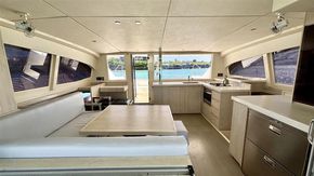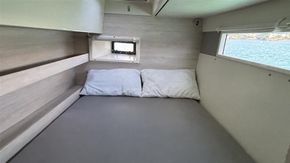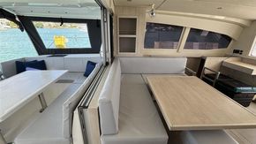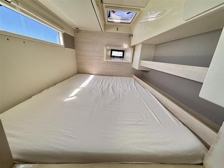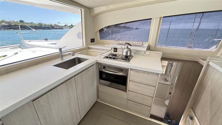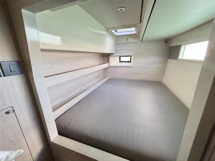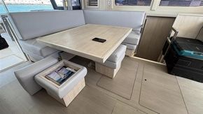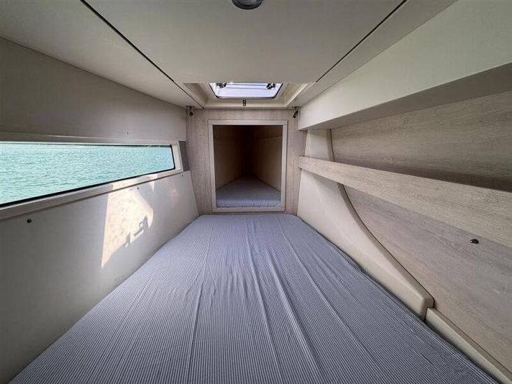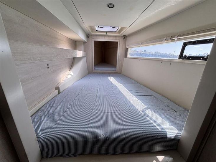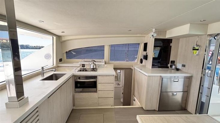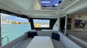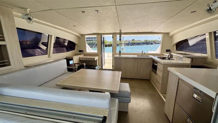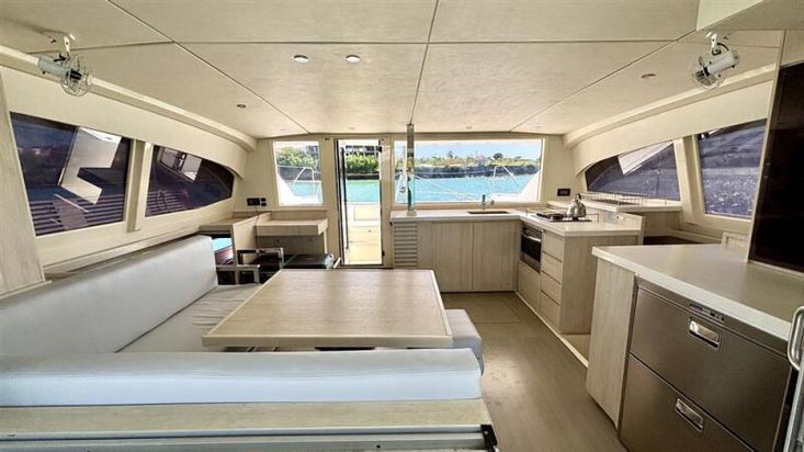 The bright, open saloon features panoramic windows, excellent ventilation, and a functional galley with ample storage and refrigeration. The cockpit is designed for entertaining and relaxing, with seamless indoor-outdoor flow, while the forward cockpit offers unmatched lounging space and added safety underway.