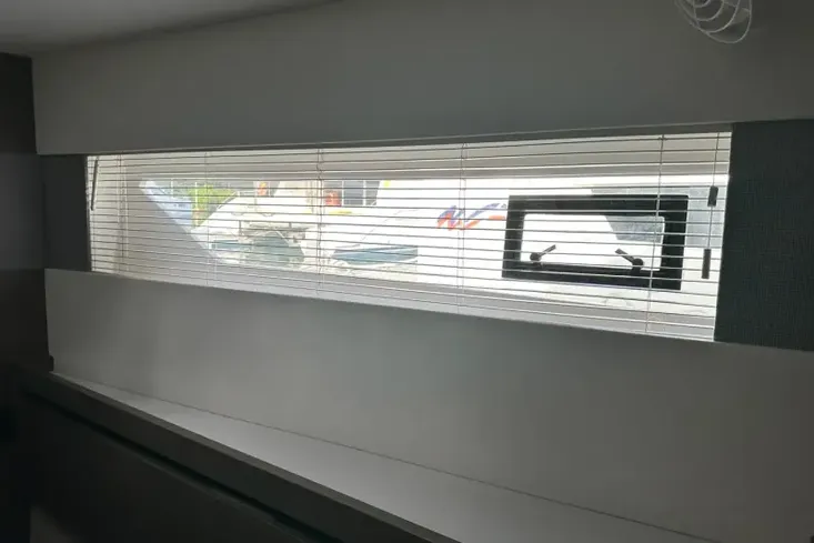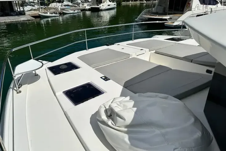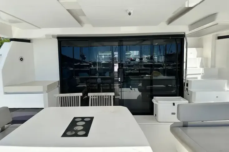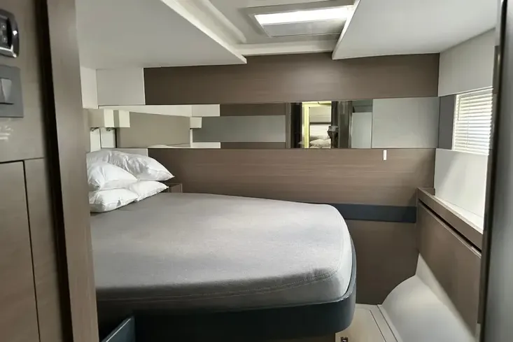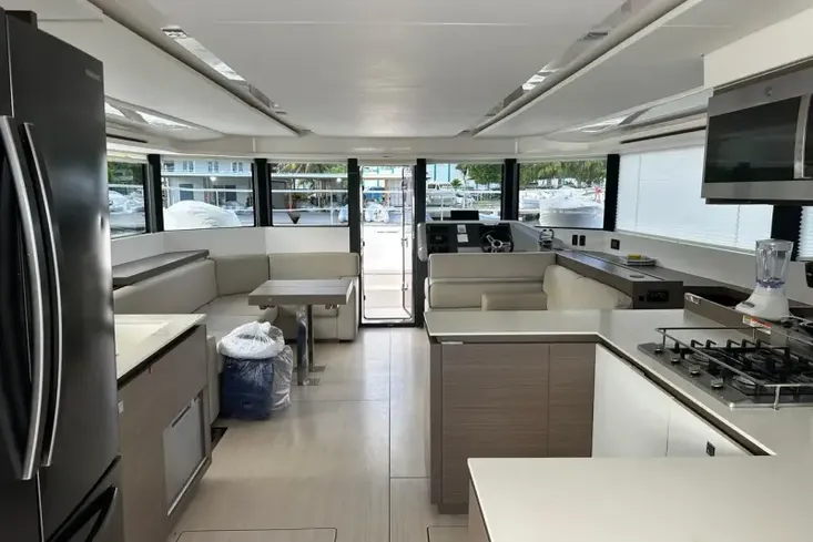 The saloon offers large, panoramic windows, an L-shaped lounge to port and a 2-person settee to starboard with an option to add an interior navigation station. The flow is seamless with access to foredeck through the forward saloon door.