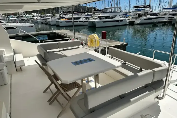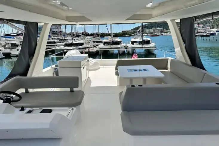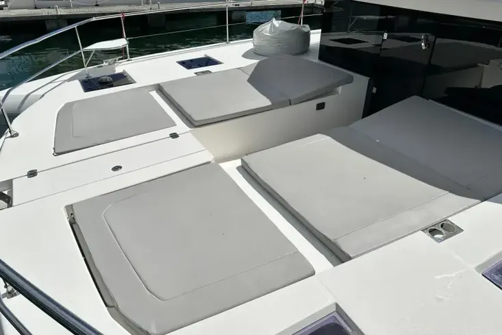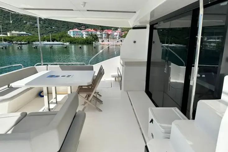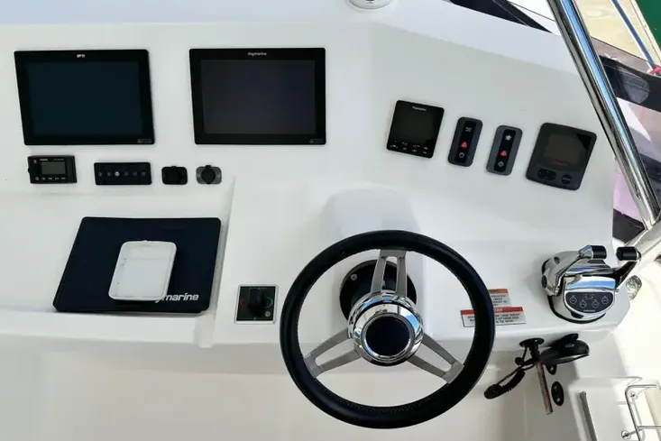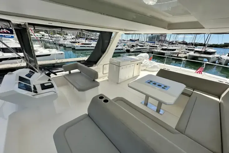 The flybridge provides a well-thought-out helm station with great visibility. Spacious seating and a large table allow for a great place to entertain family and friends and enjoy a meal with spectacular views.