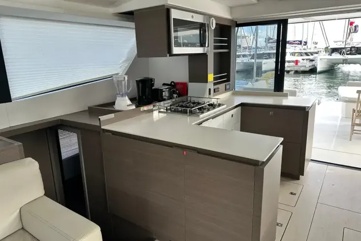 The galley is outfitted with a domestic-sized refrigerator/freezer, Staron® worktop surfaces, 4-burner stove, microwave oven, sink and faucet, and ample amounts of storage.