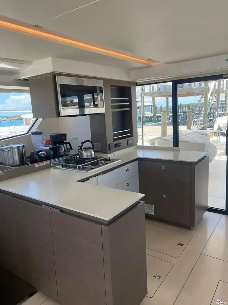 The galley is outfitted with a domestic-sized refrigerator/freezer, Staron® worktop surfaces, 4-burner stove, microwave oven, sink and faucet, and ample amounts of storage.