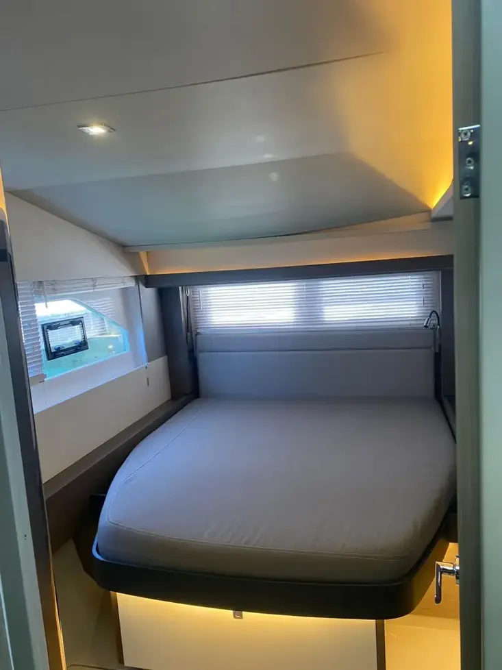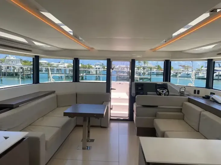 The saloon offers large, panoramic windows, an L-shaped lounge to port and a 2-person settee to starboard with an option to add an interior navigation station. The flow is seamless with access to foredeck through the forward saloon door.