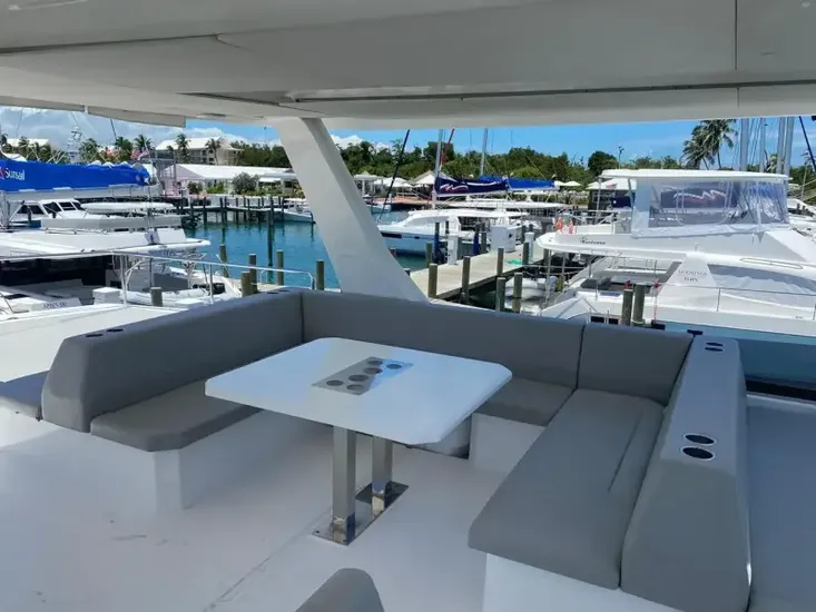 The flybridge provides a well-thought-out helm station with great visibility. Spacious seating and a large table allow for a great place to entertain family and friends and enjoy a meal with spectacular views.